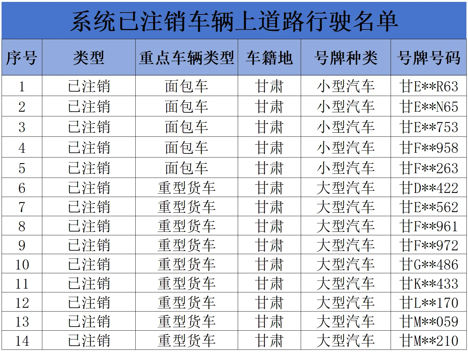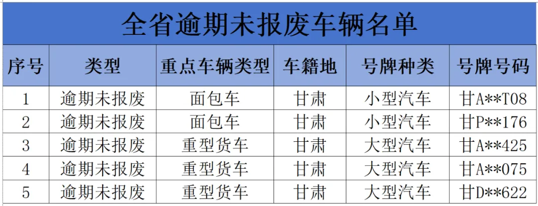 观澜新闻客户端讯(兰州日报社全媒体记者 颜维俊 杨昕)11月23日,甘肃省公安厅交通管理局曝光19辆全省逾期未报废、系统已注销上道路行驶的面包车和重型货车。