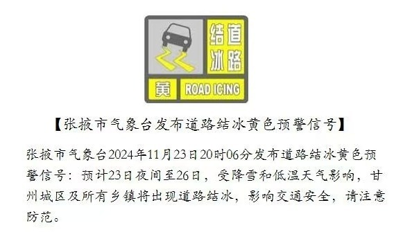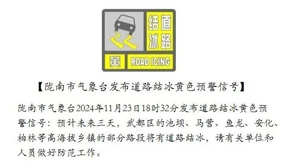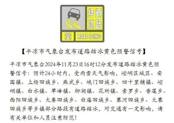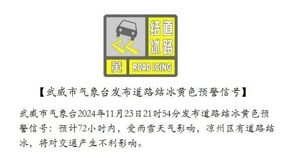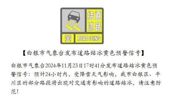 兰州市气象台2024年11月23日16时44分发布道路结冰黄色预警信号:预计今天夜间至25日白天,受寒潮降雪天气影响,城关、七里河、安宁、西固、红古部分路段及榆中、皋兰、永登、兰州新区大部路段将出现积雪或道路结冰,请注意防范对交通安全的不利影响。