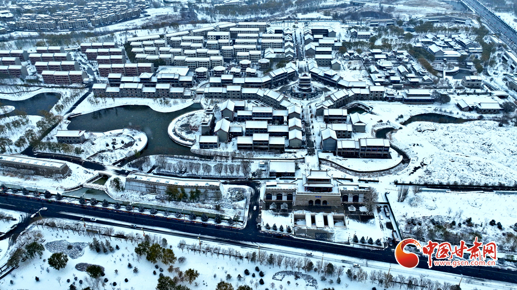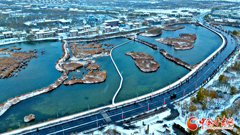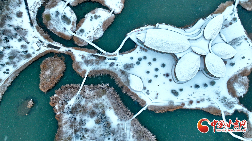 空中俯瞰张掖国家湿地公园,它宛如一幅宁静的山水画,湖畔的垂柳和芦苇仿佛戴上了洁白的雪帽,显得格外妩媚;甘州府城中的仿古建筑在雪景的衬托下更显宁静与高雅。古城钟鼓楼、张掖西站和文津公园等景区,无一不被银装覆盖,呈现出一种古朴而典雅的美。