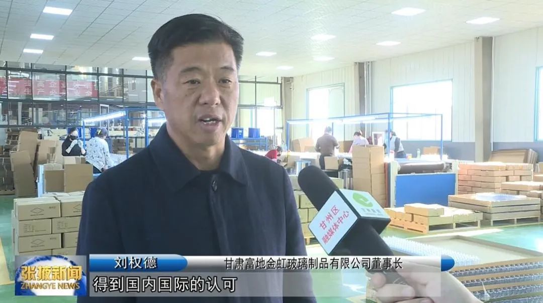 走进甘肃富地金虹玻璃制品有限公司,生产车间内,三条自动化生产线高效运转,玻璃溶液经过机器定形后,化身为各种各样精致的器皿,再由传送带缓慢冷却后,转入检验区和包装区,进行产品检验和装箱,准备运往欧洲市场。