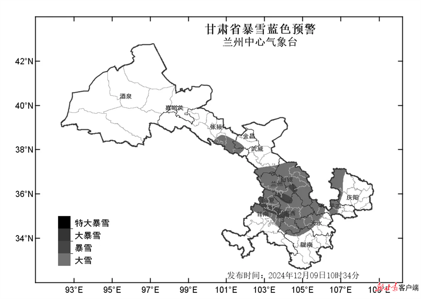 新甘肃客户端兰州12月9日讯(新甘肃·甘肃日报记者 海晓宁)今天10时34分,兰州中心气象台暴雪蓝色预警:预计9日15时至10日20时,兰州、白银、定西、临夏等市州及甘南北部、天水西部、平凉西部、庆阳西部、张掖南部、武威南部将出现大雪;临夏南部、定西西部、兰州南部、白银中部将出现暴雪。请注意防范。