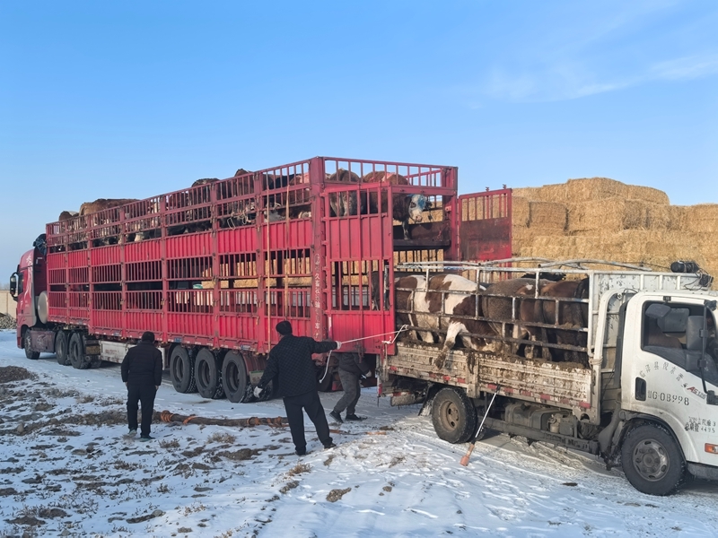 近日,走进临泽县凌峰养殖有限公司,标准化双列式温棚牛舍“非”字型排列,养殖户正在将圈舍内的褐牛装车发往市场。