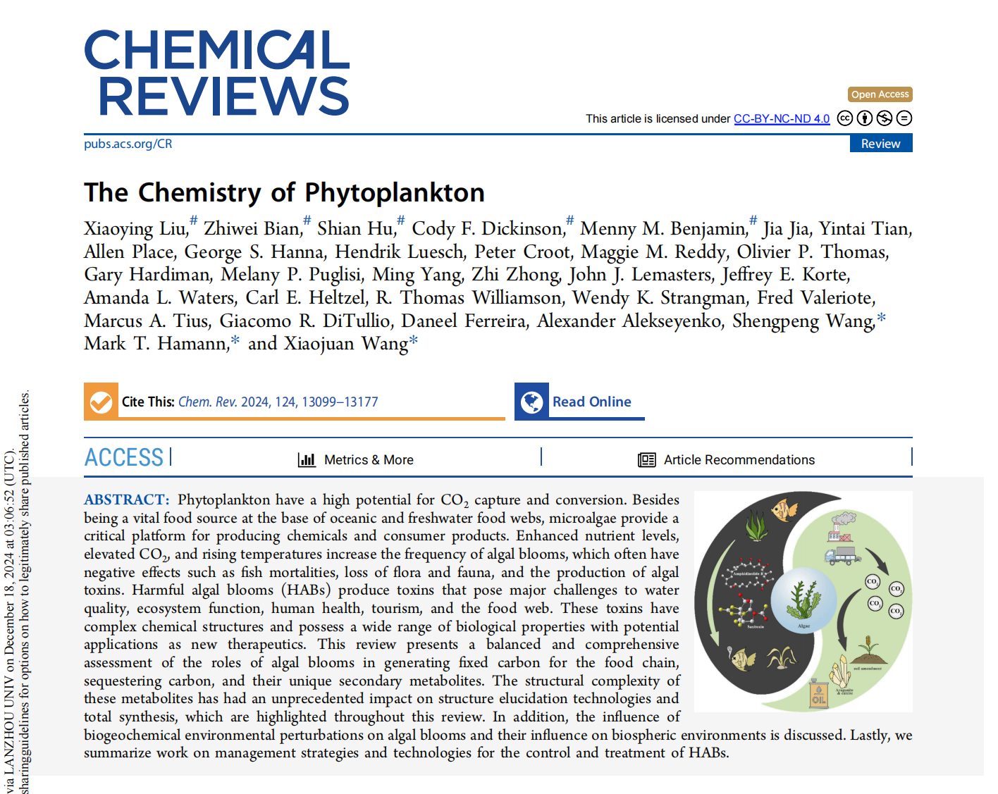 兰州大学药学院王晓娟青年研究员团队于2024年11月在《Chemical Reviews》杂志上发表了题为“The Chemistry of Phytoplankton”的综述论文(Chem. Rev.2024, 124, 13099),DOI:10.1021/acs.chemrev.4c00177,影响因子51.5。