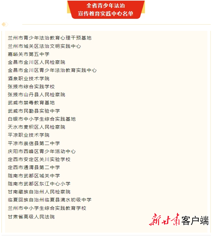 新甘肃客户端讯(新甘肃·每日甘肃网记者 李萍)近日,甘肃省司法厅、中共甘肃省委宣传部、中共甘肃省委政法委员会、中共甘肃省委全面依法治省委员会办公室联合印发《关于确定全省青少年法治宣传教育实践中心的通知》,确定兰州市青少年法治教育心理干预基地等23个实践中心为全省青少年法治宣传教育实践中心。
