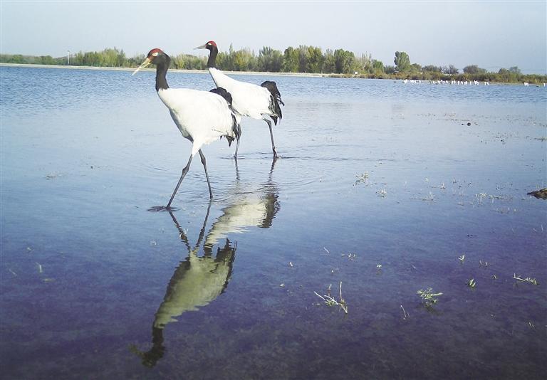 兰州晚报讯 近日,甘肃安西极旱荒漠国家级自然保护区管护中心专业技术人员在整理红外相机时发现,保护区双塔湿地的1号红外相机拍摄到了国家一级保护动物黑颈鹤。它们从相机前步履匆匆地走过,颇有喜感。同时,相机还拍摄到两只黑颈鹤并排漫步的照片。