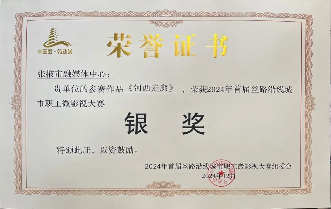 12月28日下午,“中国梦·劳动美”2024年首届丝路沿线城市职工微影视大赛在西安揭晓,由张掖市总工会选送的四件作品斩获殊荣,其中音乐MV《河西走廊》获得银奖,《借牧》《最后的老铁》和《秸尽其用·一麦相承》三部纪录片获得优秀奖,张掖市总工会荣获大赛突出贡献单位。