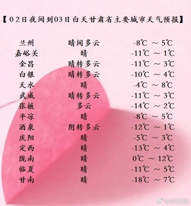 受冷空气影响,3日夜间至4日,我省将有一次降温、大风沙尘、降水天气过程。全省自西向东气温下降3~5℃,甘南降幅可达6~8℃;河西五市及甘南、白银市北部、庆阳市北部有5~6级西北风,其中甘南阵风可达8~9级,上述地区局部地方有沙尘天气;河西五市及陇中、甘南的部分地方有小雪。需防范降温、大风沙尘及降雪天气对交通运输、农牧业、能源供应等的不利影响。