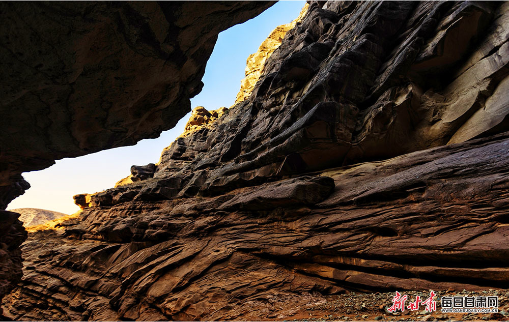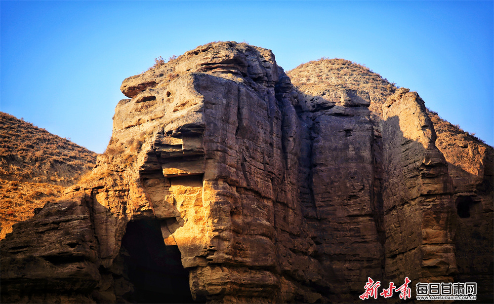 冬日的永靖县道水沟大峡谷天空清湛,仿若无边无际的蓝色碧海,温暖的阳光挥发着金色的光芒,在空中跃动,山峰上空的白云与风交舞,像精灵一般自由自在,轻盈美好。