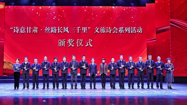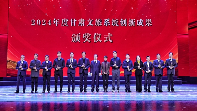 当晚的展示活动中,文艺演出与颁奖环节紧密结合、穿插进行,先后表彰了2024年度在甘肃文旅新媒体宣传、剪纸非遗创新发展、交旅融合、产业招商引资、品牌创建、文博场馆创新提升、全民阅读推广、非遗工坊建设、文创产品、艺术创作、旅游市场开拓、景区融资扩展、研学旅行、文明旅游、市场监管、工业旅游、文旅诗会等方面表现优异的单位和个人,激励甘肃文旅人启新程、再出发,为文旅强省建设做出新的更大贡献。(文/甘肃省文化和旅游厅 宣学洲 图/甘肃演艺集团 张曦予 郭一)