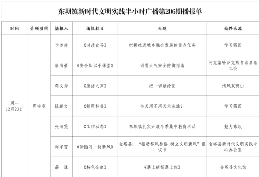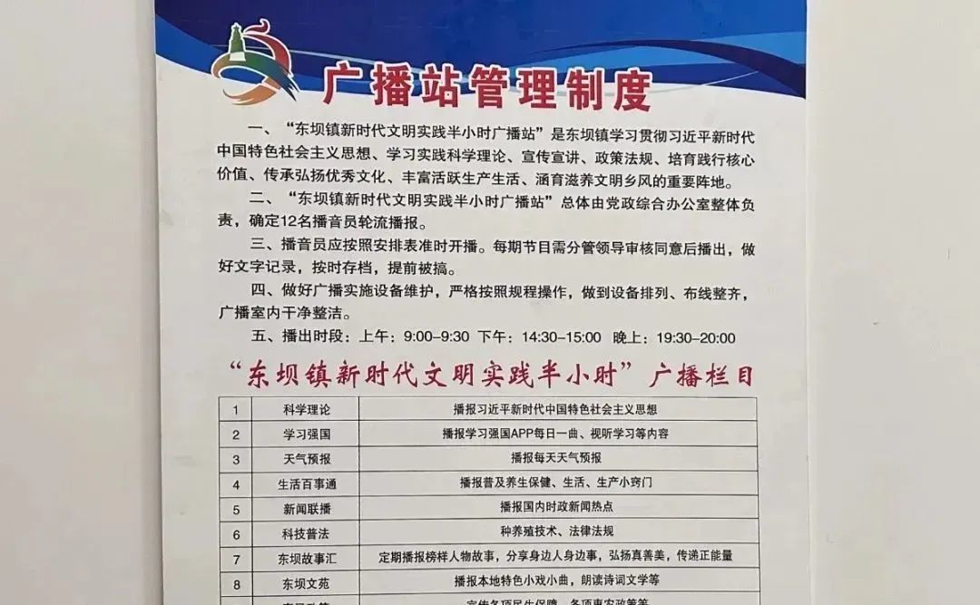 瞄准需求制清单,传播实践广播“好声音”。为真正让乡村大喇叭接地气、冒热气,东坝镇新时代文明实践半小时广播栏目坚持以人民为中心的工作理念,从群众实际需求出发制定内容,出台“1+X”广播栏目清单,“1”即以党的最新理论政策为固定播音内容,“X”即群众关心关注的各项惠农政策、移风易俗、文明乡村、法律法规、环保知识、防火禁烧、防抢防骗、天气变化等20方面内容。同时,紧扣特殊时期农民需求,结合实际动态调整播放内容,确保对当前时间节点下的信息热点、安全生产、文明行为、健康生活等内容进行全方位、全覆盖宣传普及,有效提高了广大群众安全生产、防灾减灾等方面能力,切实发挥了广播“急时应急、平时服务”的优势。
