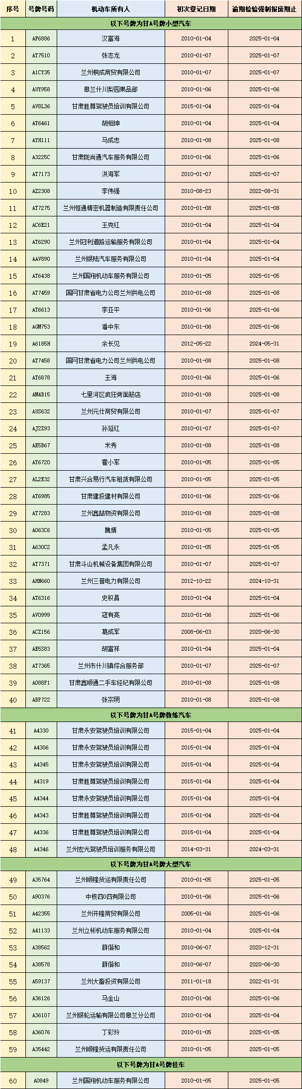 为进一步深入推进交通事故预防“减量控大”的总体工作目标,全力预防和减少道路交通事故的发生。兰州公安交警本期曝光以下60辆达到报废标准需要公告牌证作废的车辆!请尽快办理报废手续!