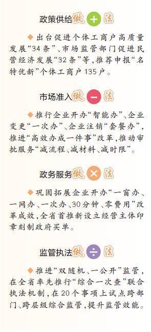 政策供给做加法。出台促进个体工商户高质量发展“34条”、市场监管部门促进民营经济发展“32条”等,推荐申报“名特优新”个体工商户135户。开展“包抓联”“六必访”等活动,多部门联合搭建“政银企”对接服务平台,联系走访经营主体3000多户次,协调解决问题32件,办理创业担保贷款155户2838万元。出台《市场主体集群注册登记监督管理办法》,鼓励发展集群注册、工位注册,促进数字经济、总部经济集聚发展,受益经营主体1.3万余户。