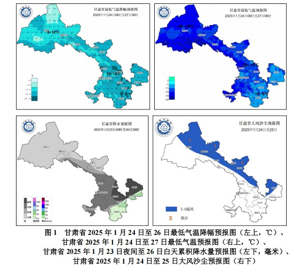 气象部门预计,全省大部有降水,陇东南、陇中东部累积量可达10至20毫米,其余大部2至10毫米,主要降水时段为24日白天至25日白天,陇东和陇中东部有暴雪。伴随降雪,全省最低气温下降8至10摄氏度,河西东部、河东大部降幅可达12摄氏度以上,出现寒潮。26至27日,河西西部、甘南最低气温可降至零下28至零下18摄氏度,河西东部、陇中、陇东零下20至零下15摄氏度,陇南、天水零下16至零下8摄氏度。河西五市及白银、平凉、庆阳三市有5至6级西北风,24日河西伴有短时扬沙或浮尘。