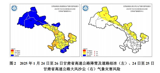 交通方面,本轮强降雪寒潮天气正值春运高峰期,可能造成的道路积雪、结冰、低能见度等,将对春运工作产生不利影响。24至26日,G3017金武高速、G30连霍高速(古浪-永昌段)、S55北仙高速、G2012定武高速、S38王夏高速、G1816乌玛高速(临夏至合作段)、S60西会高速、银百高速(甜水堡至曲子)降雪、道路结冰气象灾害风险较高;24至25日,G7京新高速、G30连霍高速(瓜州至古浪段)、G0611张汶高速、G3017金武高速、S17金永高速、S55北仙高速、G6京藏高速(刘寨柯至白银段)、G2012定武高速、G1816乌玛高速(景泰至中川机场段)、S60西会高速、G22青兰高速(太白-驿马段、西峰-长庆桥-四十里铺-崆峒山段)、S25静天高速、S11泾华高速、G85银昆高速、G70福银高速、G69银百高速(甜水堡至曲子)高速大风沙尘对交通有一定影响。
