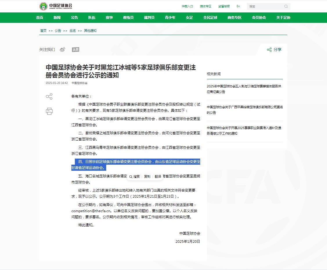 1月20日下午,中国足协官网发布《通知》,对5家足球俱乐部申请变更注册会员协会进行公示,公示时间为1月21日-23日。其中,日照宇启足球俱乐部申请变更注册会员协会,由山东省足球运动协会变更至甘肃省足球运动协会。这意味着,日照宇启足球俱乐部将离开山东,落户甘肃。