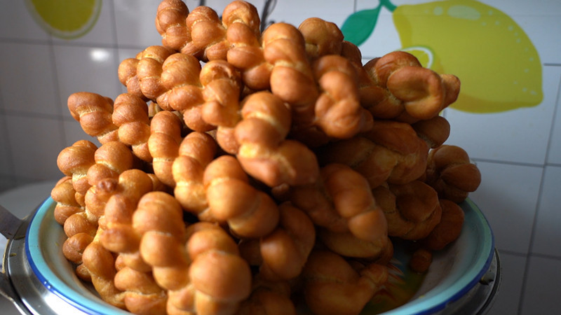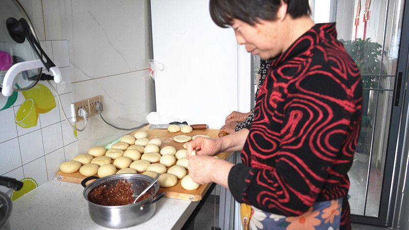 和面、擀面、包馅料……室外寒气逼人,但在许金凤家里却是暖意融融,她正和家人在厨房里炸油饼。在大家的欢声笑语中,一块块面团三两下就擀成了一个个油饼;一根根细长的面条经过一双双巧手的按压、揉搓,变成了一根根麻花。油温适当时放入已经擀好的油饼和麻花,一边炸,一边轻轻翻动……不一会儿,金黄的油饼、麻花便出锅了,浓郁的香味和大家的笑声相伴,浓浓的年味让家里更显温馨。