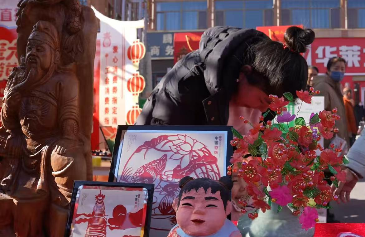 根雕、剪纸、彩绘、香包等一系列代表金塔文化精髓的非遗展品也在年货节市场精彩亮相。其中,剪纸以其独特的图案设计、精湛的技艺成为全场焦点,不少剪纸爱好者纷纷围在民间艺人身边,饶有兴致地跟着学习剪窗花。