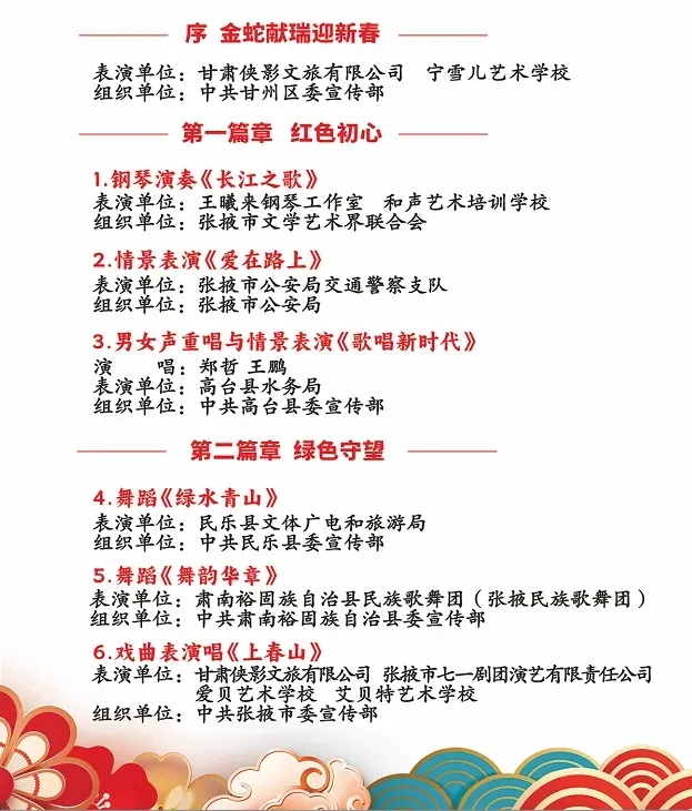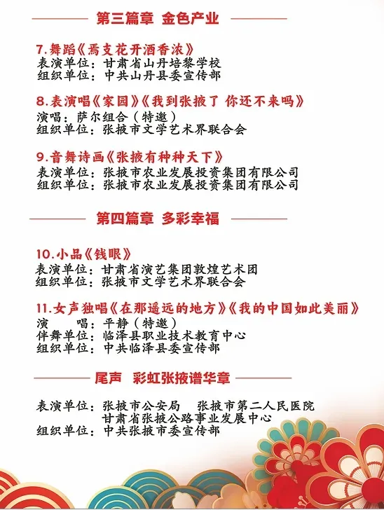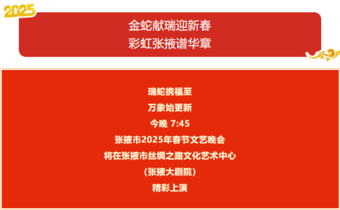 为弘扬中华民族优秀传统文化,丰富群众精神文化生活,做靓打响“我们的节日”文化品牌活动,1月23日将举办“金蛇献瑞迎新春·彩虹张掖谱华章”张掖市2025年春节文艺晚会。