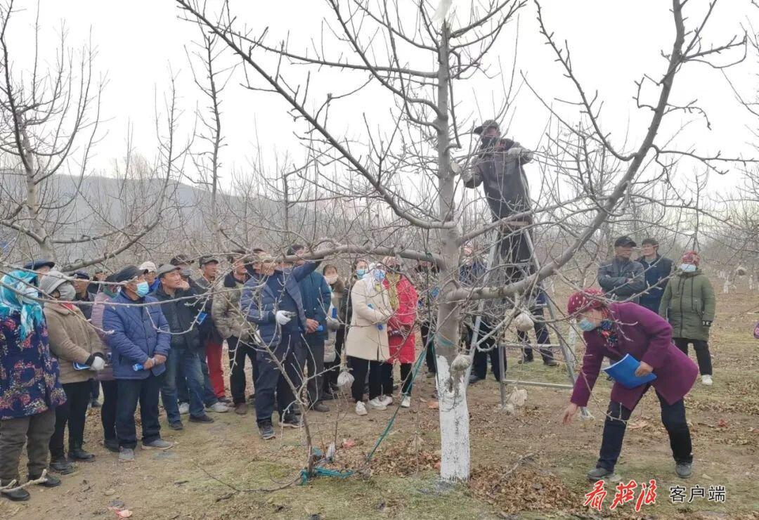 在赵墩乡的一片果园里,技术人员为果农讲解春季修剪的技术要领,并耐心地示范着如何剪去病虫枝、过密枝,如何保留结果母枝,果农们听得认真,不时提出疑问。