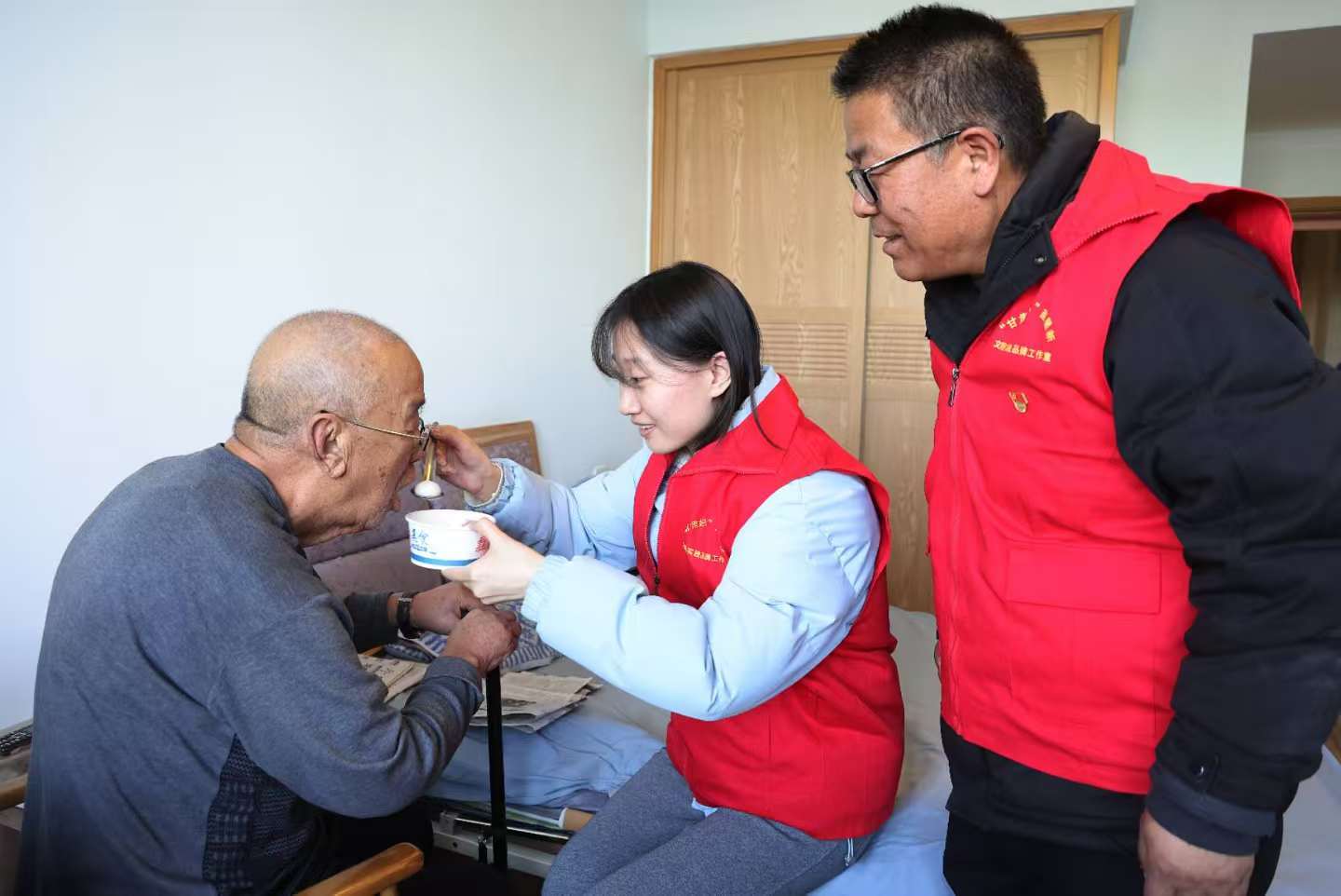 元宵煮好后,志愿者们将热气腾腾的元宵,或递到老人们面前,或送到老人们床前。当看到86岁的王庭权老人因病右手颤抖、端碗困难时,志愿者耐心地一口一口喂他吃完元宵。老人激动地握住志愿者的手表达感谢:“谢谢你们在元宵佳节之际来看望我们,太感谢你们了!”