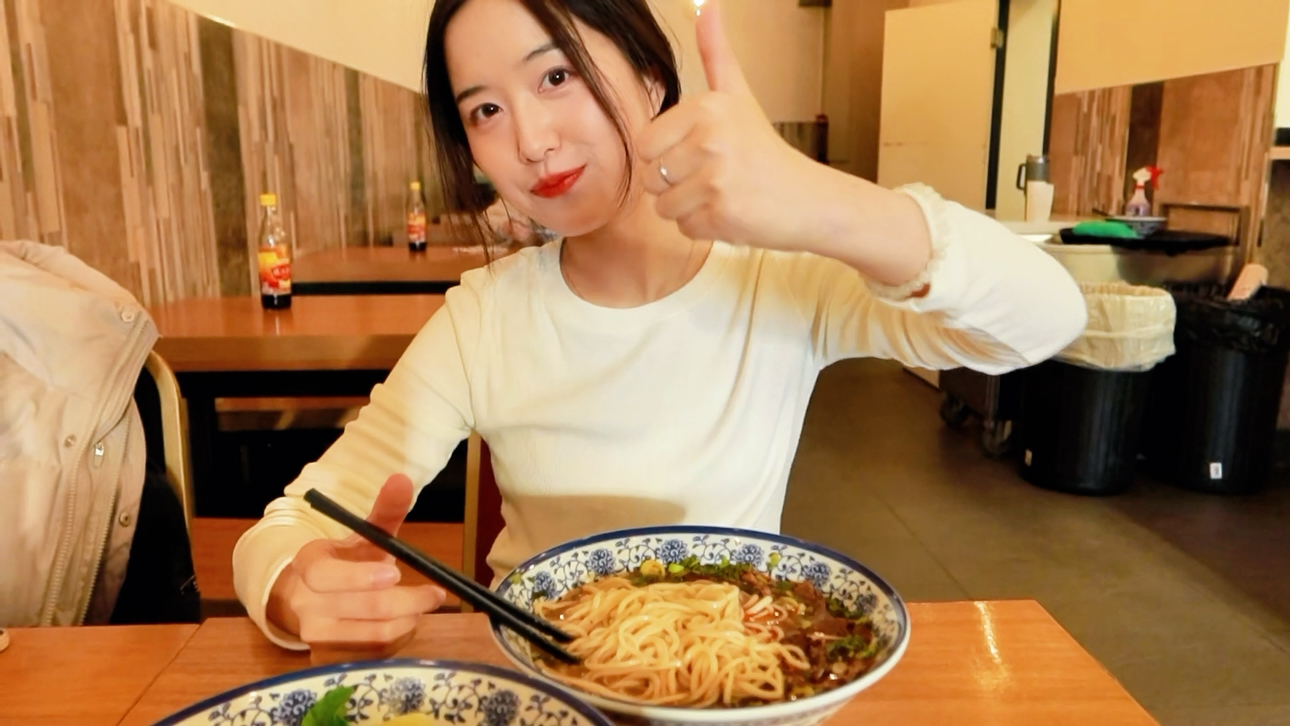 虽然身处异国他乡,但这家兰州牛肉拉面的制作工艺依旧传承着兰州的传统,每一碗面都蕴含着兰州的匠心,每一口都是兰州的味道。据牟阳介绍,别看这家店的拉面的师傅是个外国人,那拉面的手法非常娴熟,听说是专门从兰州拜师学艺归来的。“师傅现场手工拉面,面条口感很棒,牛肉的分量也很足。”每次和同学朋友来这里吃面,地道的兰州味道总会让她赞不绝口。大口吃面,大块吃肉,大碗喝汤,碳水带给海外游子的快乐,在这一碗“牛大”里全都可以实现。
