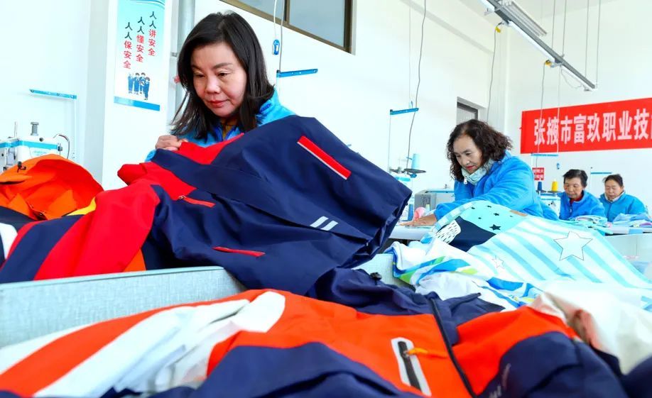 2月14日,张掖市富玖职业技能培训学校校服生产线上,工人们正在加紧赶制春季校服,供应各中小学校。