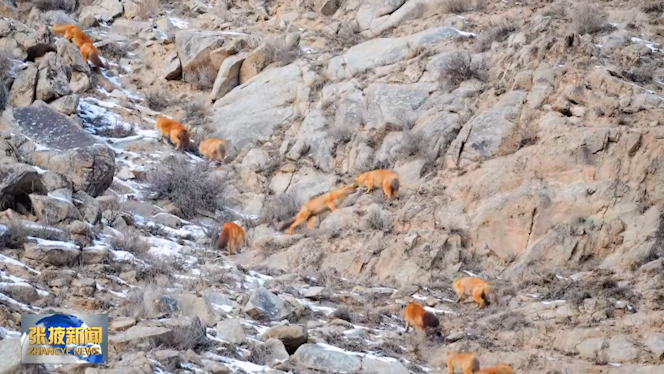 近日,在甘肃祁连山国家级自然保护区肃南段,工作人员通过相机捕捉到9只国家一级保护动物豺在雪山间觅食活动场景。