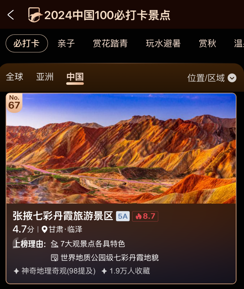 原标题:张掖七彩丹霞旅游景区入选“携程口碑榜2024中国100必打卡景点”榜单