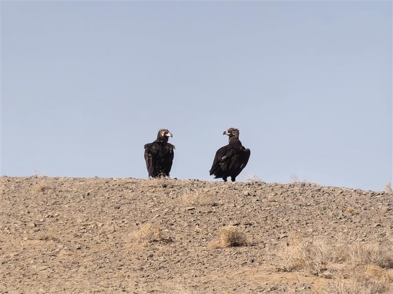 兰州晚报讯 近日,甘肃民勤连古城国家级自然保护区管护中心三角城保护站工作人员在日常巡护中,意外拍摄到远处山头上栖息的几只体型巨大的鸟类。经过询问专家、查阅资料,图片比对,确定这几只神秘的大鸟是国家一级重点保护野生动物秃鹫。