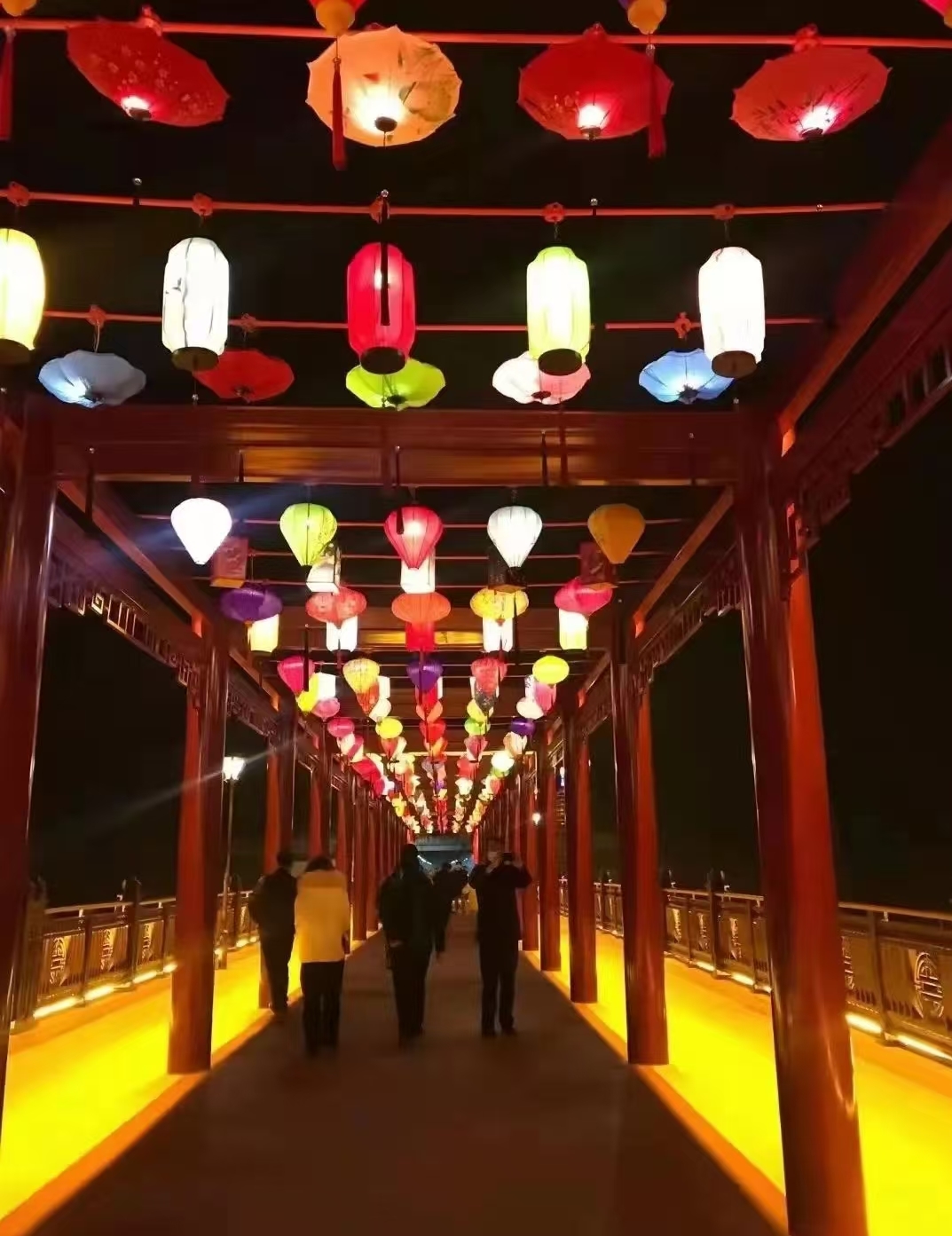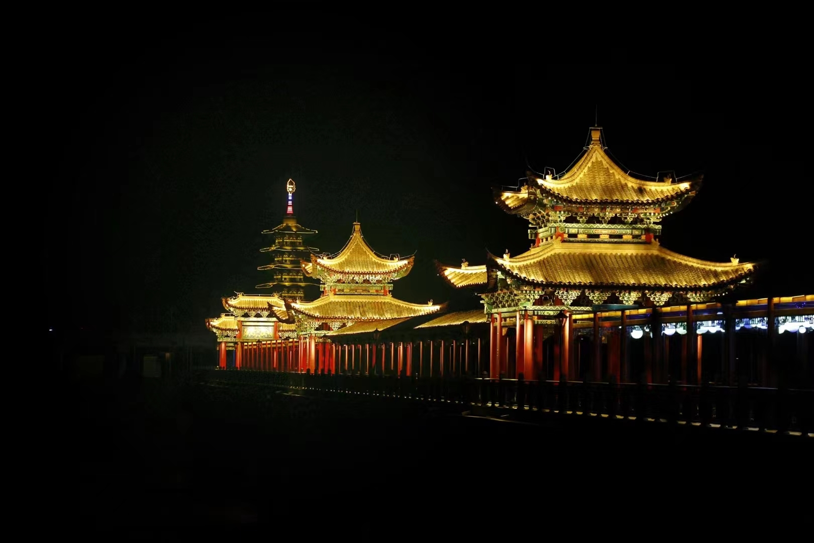 夜晚,在五光十色的灯光映射下,泾河大桥金光灿灿,泾河波光闪闪,宛若仙境。