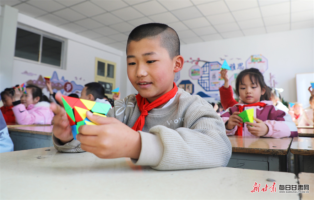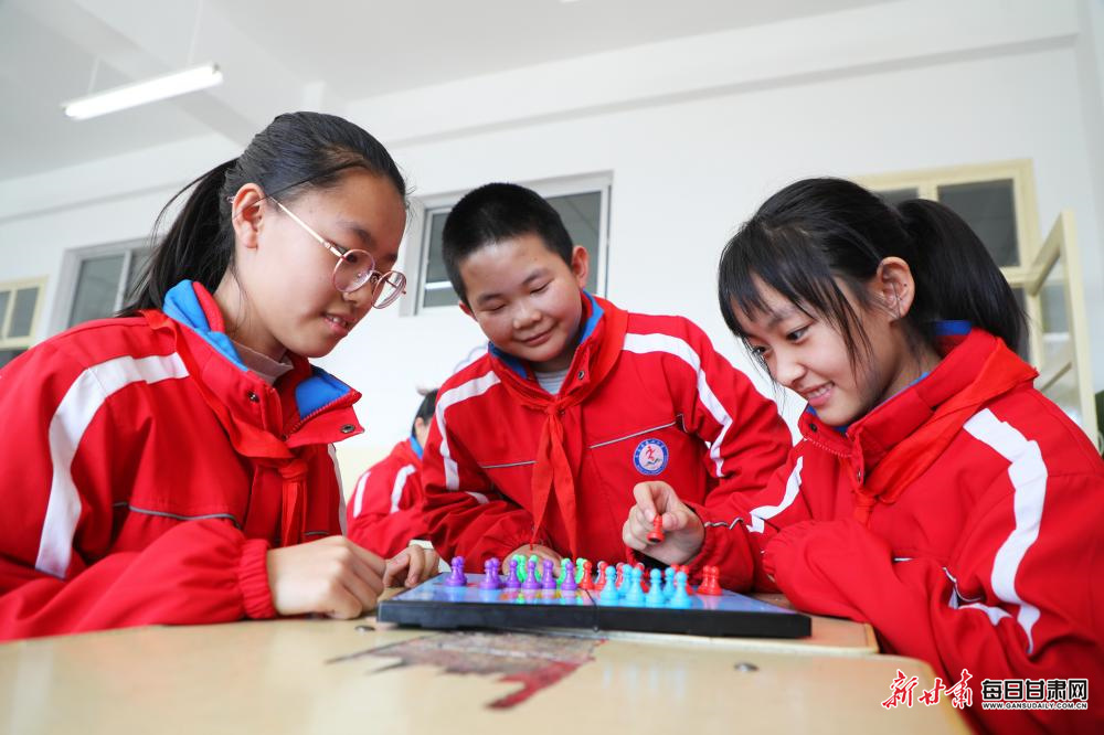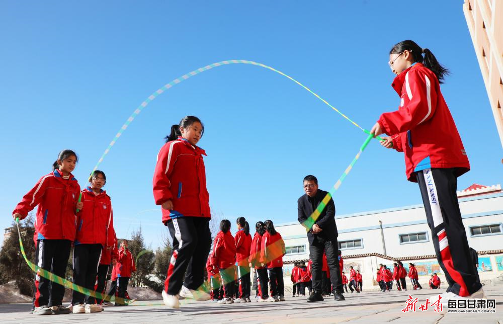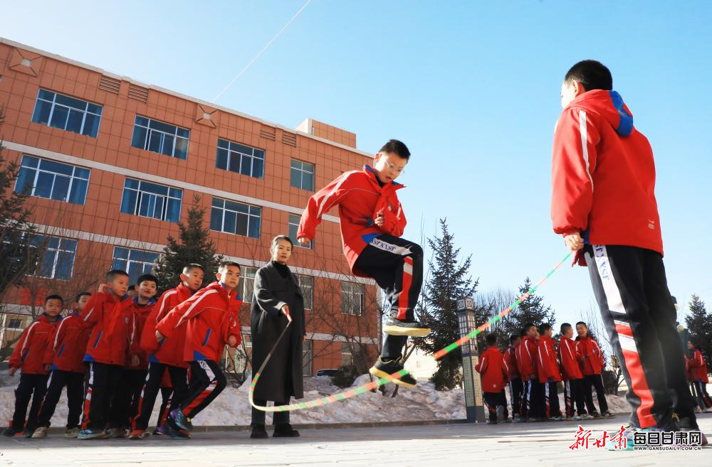 3月4日,在张掖市民乐县金山小学,学生们在课间开展丰富多彩的文体活动。