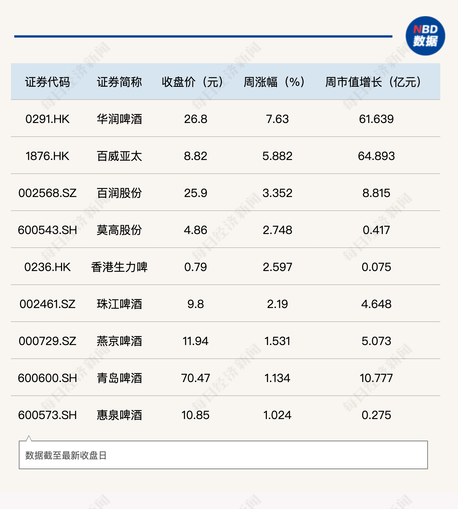 ◎春节后,啤酒股表现强劲,本周华润啤酒和百威亚太周涨幅分别达7.63%和5.88%,市值增长显著。然而,兰州黄河股价却逆势下跌4.89%,市值缩水超6000万元。