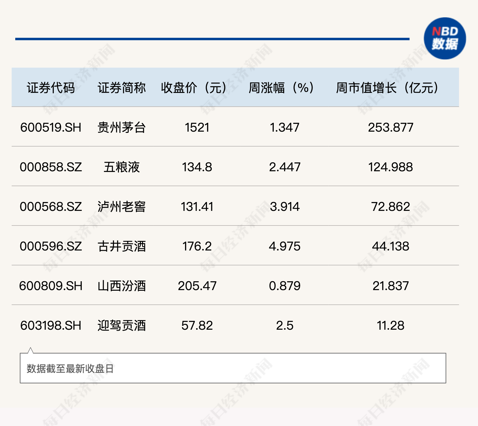 本周,白酒行业震荡调整。其中,一线白酒品牌表现明显优于二三线白酒品牌,古井贡酒、泸州老窖本周分别上涨4.98%和3.91%,贵州茅台和五粮液周市值增长分别达到254亿元和125亿元。跌幅榜上,皇台酒业、珍酒李渡、酒鬼酒、舍得酒业以及金种子酒周跌幅则均超过2%。
