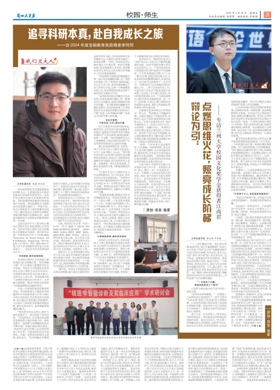 这是信息科学与工程学院计算机应用技术专业2022级博士生李同同,他所研究的计算机与医学影像结合的最新应用成果,相关研究以第一作者身份在去年3月份被IEEE Transactions on Neural Systems and Rehabilitation Engineering(IF=4.8,JCR 1区)收录。同时,他是2024年度兰州大学宝钢教育奖学金八位获得者之一,也是其中仅有的两名研究生之一。