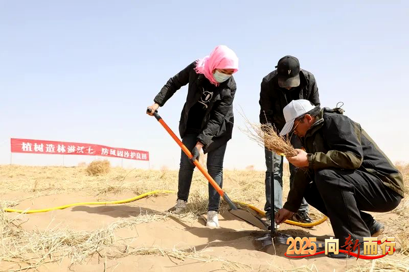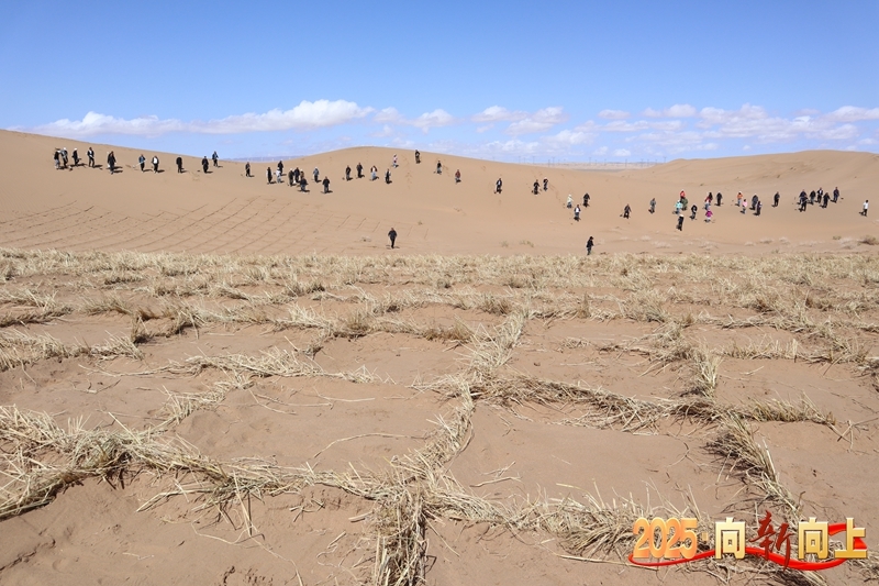 连日来,在临泽县北部沙区防沙治沙工程现场,运送麦草的工程车辆往来穿梭,临泽县治沙林场正组织治沙工人和当地群众压沙障、栽梭梭,开启又一年“治沙播绿、改善生态”防沙治沙“接力赛”。