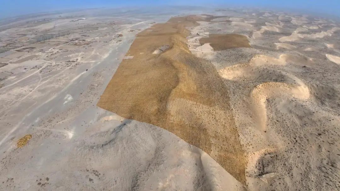 甘肃宝天建设工程有限公司技术员夏亮州:盐池沙窝十标段施工总面积是2875亩,自2月24日开工以来,现已完成1000亩,现在草方格是一米乘一米的规格,它可以阻止沙丘的流动,起到防沙固沙的作用。