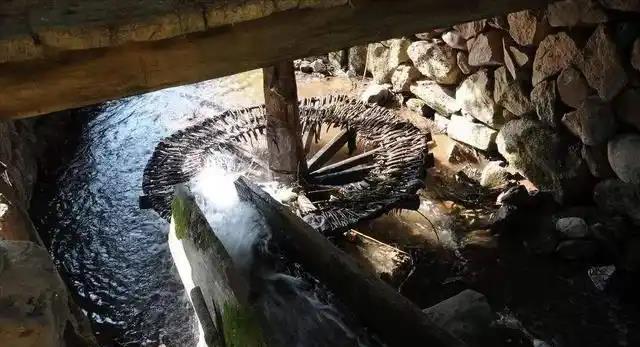 水磨的原动力来自从河流中用引水坝聚拢而来的渠水。木槽安置在渠口,倾斜向下,当水流通过木槽时,速度加快,水力增强,从槽口冲向木轮,强力推动木轮转动。木轮通过磨轴与磨盘相连,从而带动磨盘旋转,将粮食粉碎。这一过程,充分利用了自然的水力资源,可谓环保又高效。