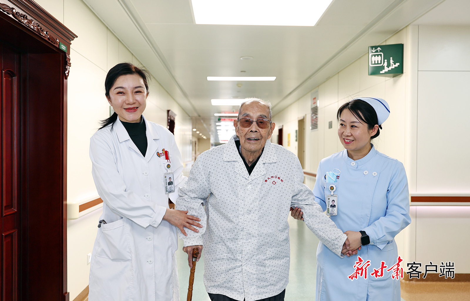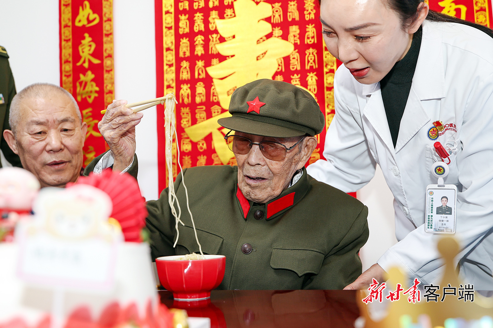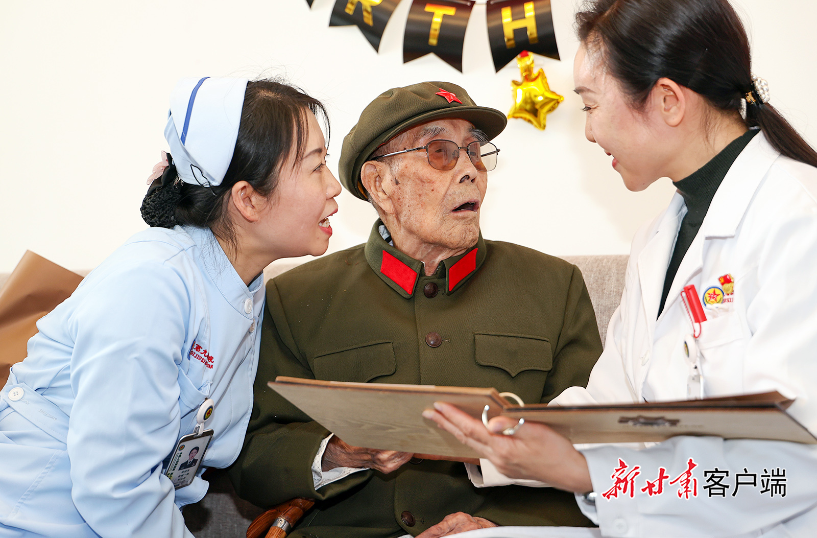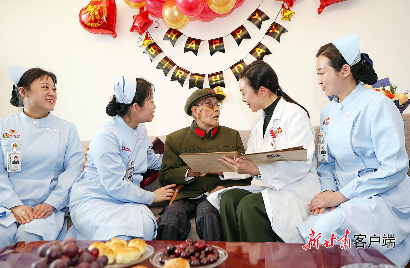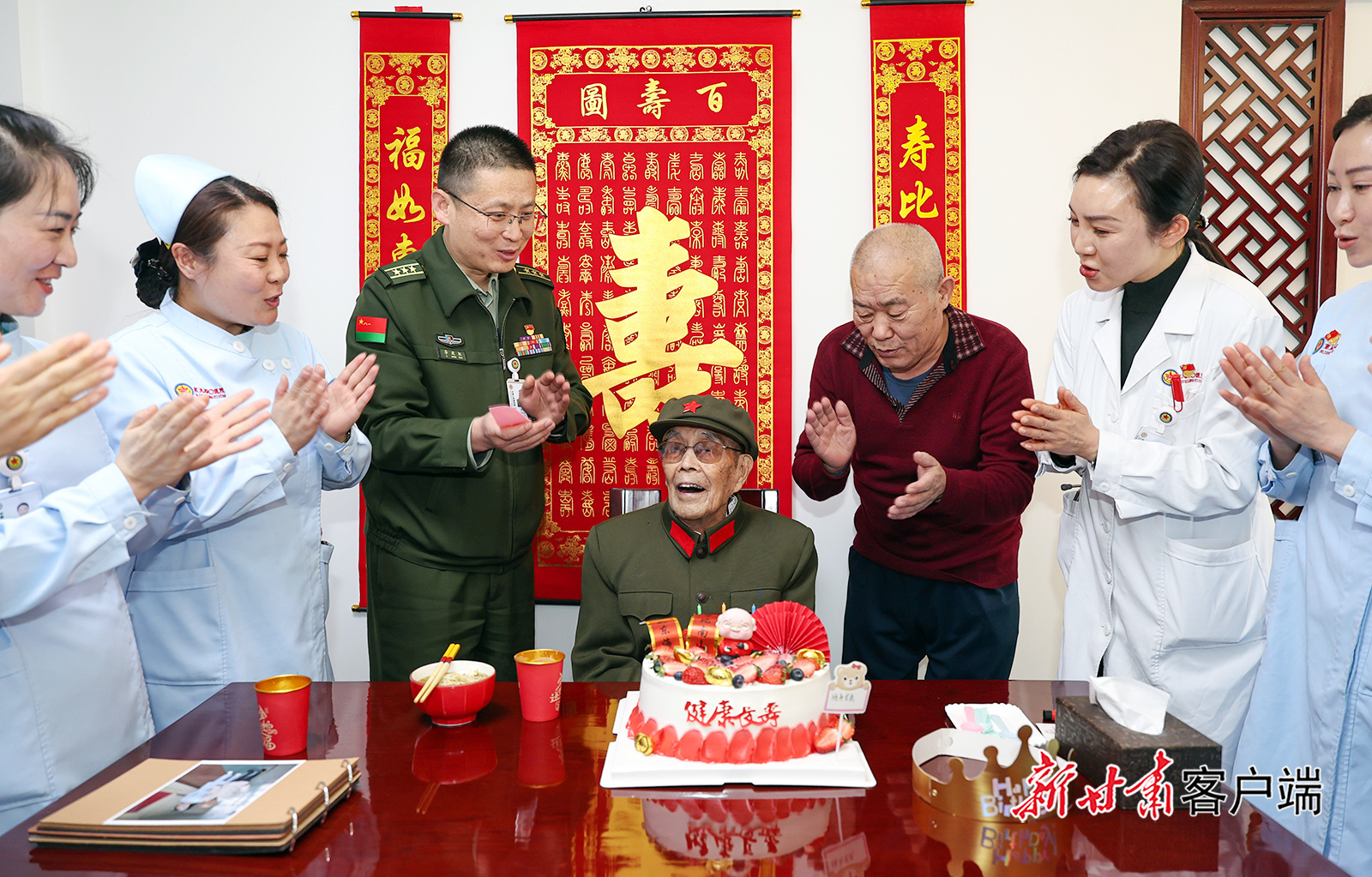 3月14日,解放军联勤保障部队第940医院医护人员和幼儿园小朋友,为住院治疗的老红军鲍彦章献上蛋糕和鲜花,庆祝他102岁生日。