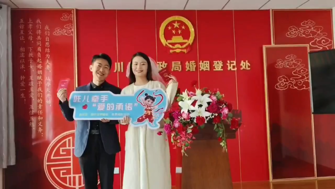 近日,金川区新时代文明实践中心联合金川区民政局开展“‘吒儿’牵手·爱的承诺”践行文明婚俗免费观影活动,每对前来领取结婚证的新人只要共同完成《文明婚俗承诺》并发至微信朋友圈就能领到两张电影票,引导新婚夫妻树立文明、健康的婚姻观念,同时也为新人们的幸福时刻增添一份独特的纪念。