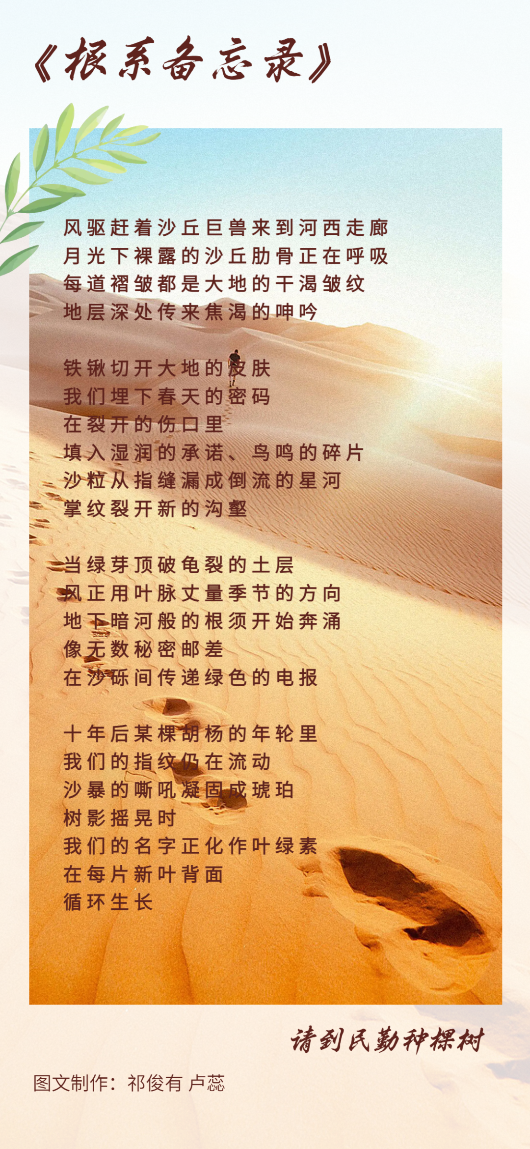 春风万物生,正是好时节。2025年“请到民勤种棵树”活动正在进行中,全国各地的游客、大学生、青年志愿者纷纷参与到“黄沙披绿衣”的绿色实践中,书写着属于自己的《根系备忘录》,让绿色希望在沙漠中扎根,在时光长河中抽枝展叶!