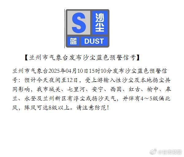 兰州市气象台2025年4月10日15时10分发布沙尘蓝色预警信号:预计今天夜间至12日,受上游输入性沙尘及本地扬尘共同影响,兰州市城关、七里河、安宁、西固、红古、榆中、皋兰、永登及兰州新区有浮尘或扬沙天气,并伴有4~5级偏北风,阵风可达8级以上。请注意防范!