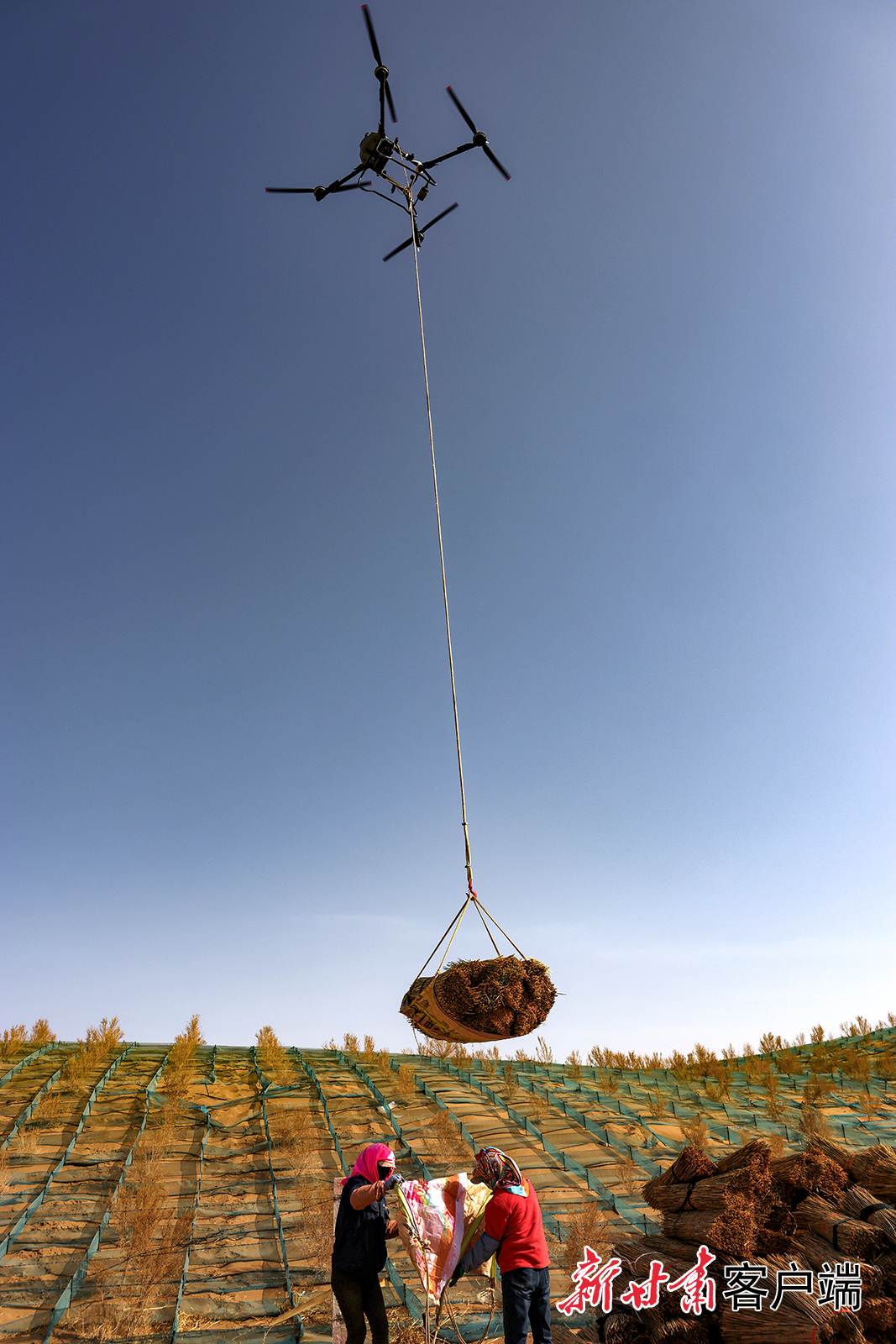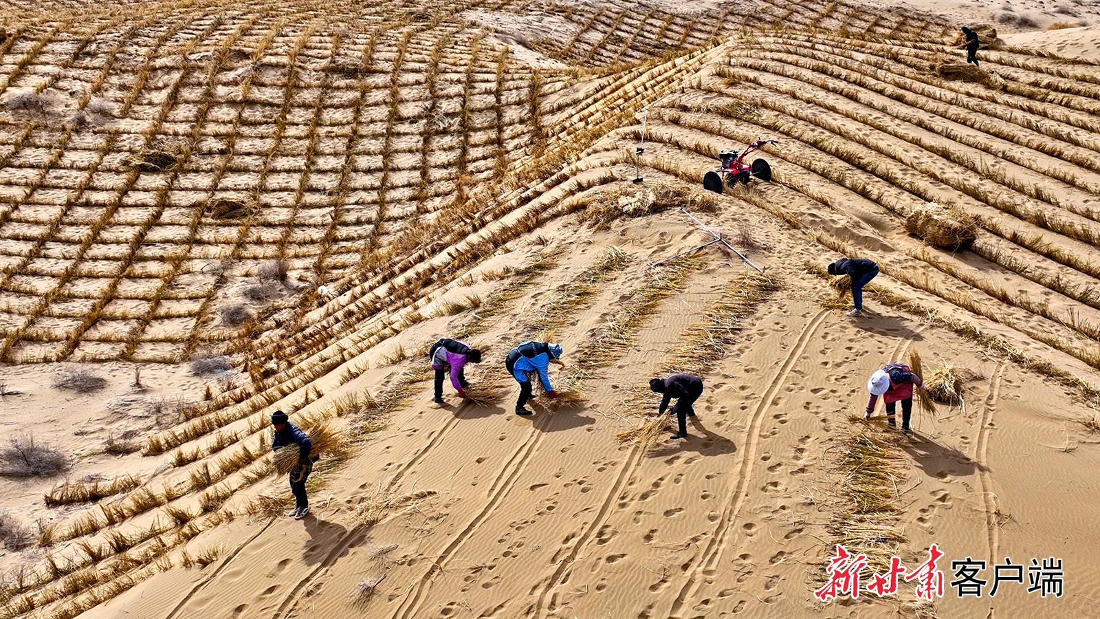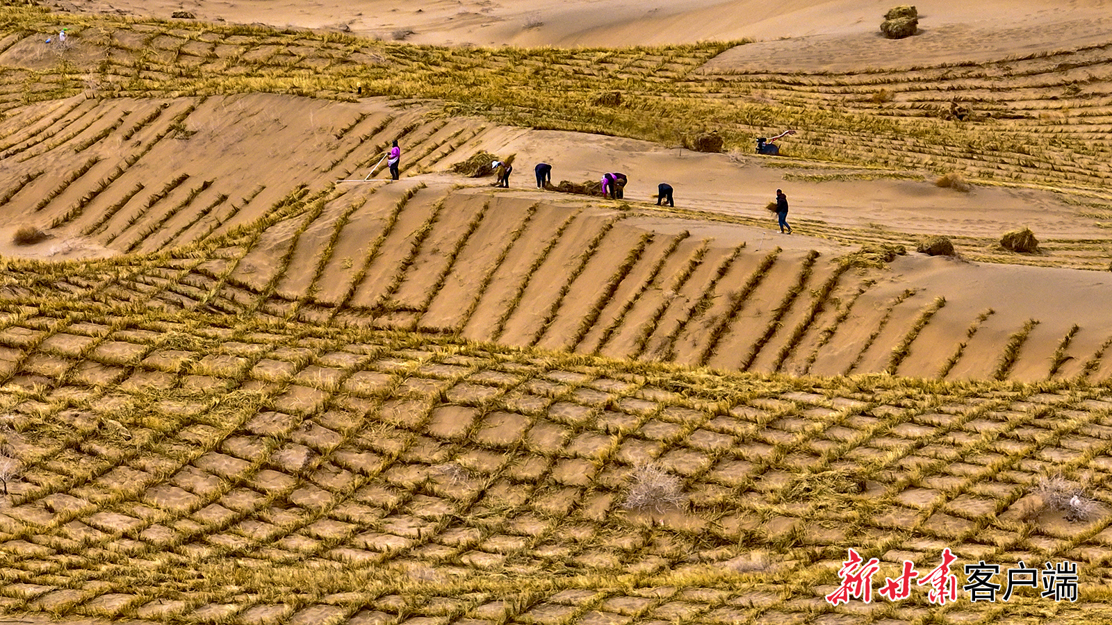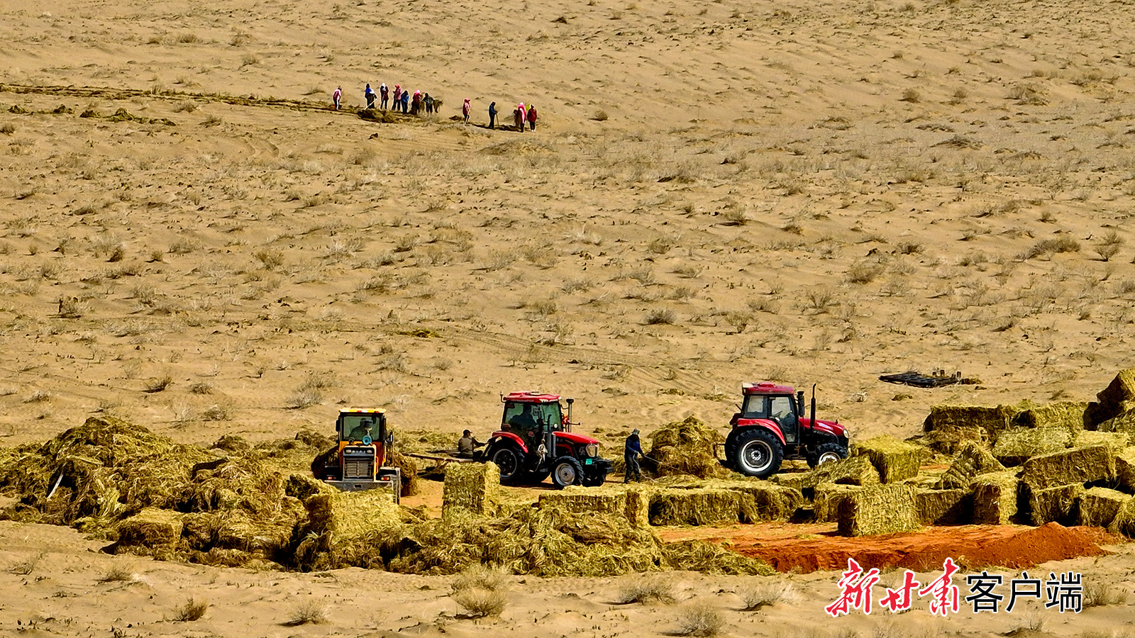 3月20日,在临泽县巴丹吉林沙漠南缘,运送稻草的车辆来回穿梭,千名治沙工人在沙丘上营建沙障和固沙林带。新甘肃·甘肃日报通讯员 王将 张延平