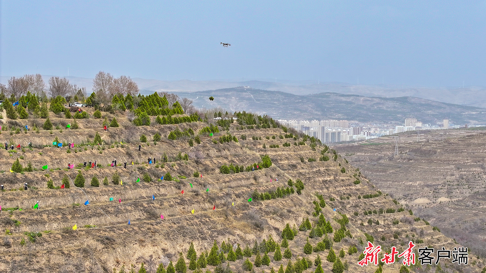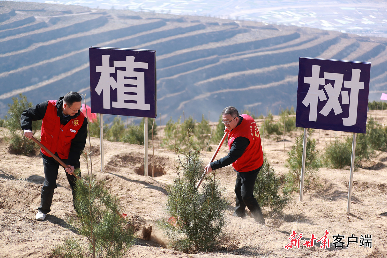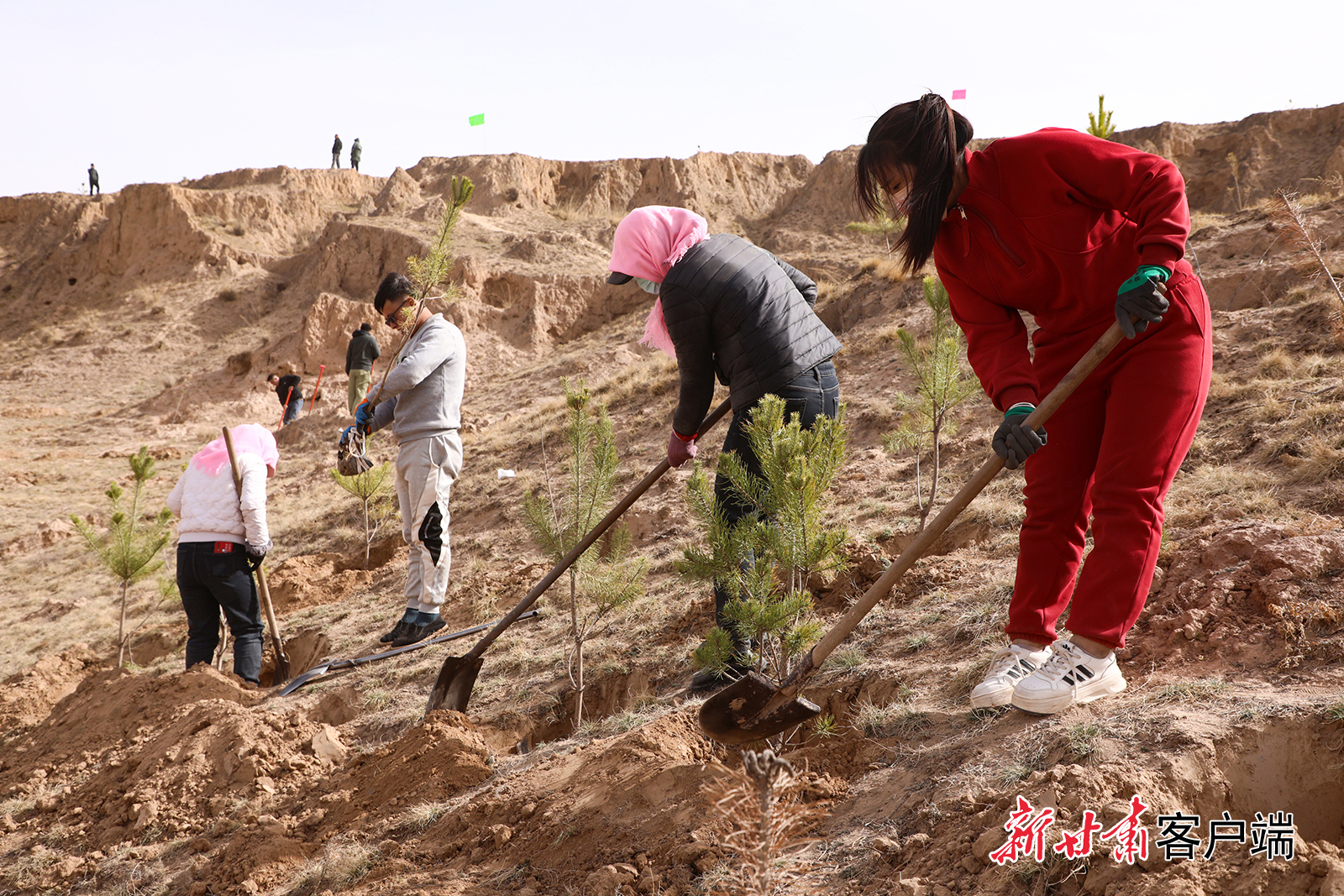 4月8日,通渭县城区面山绿化义务植树活动在平襄镇温泉村北山展开,全县县直128个责任单位的干部职工挥锹铲土、扶苗培根,为通渭生态建设再添新绿。新甘肃·甘肃日报通讯员 张赛 李和