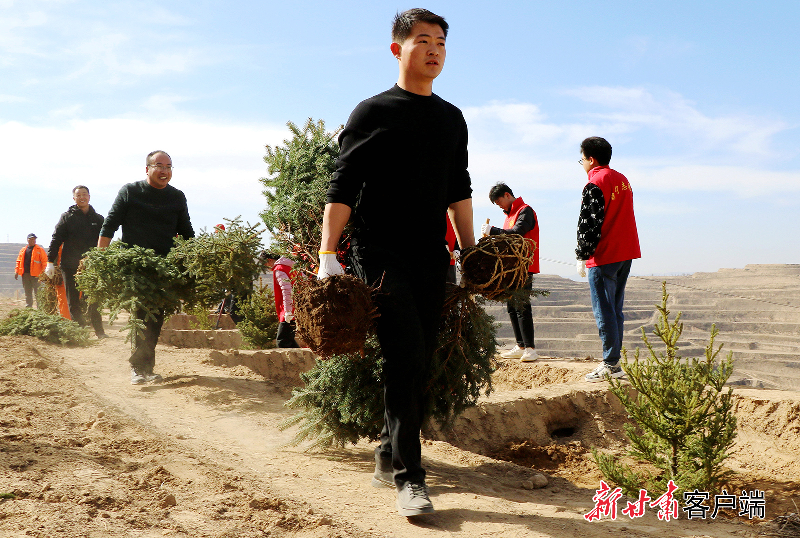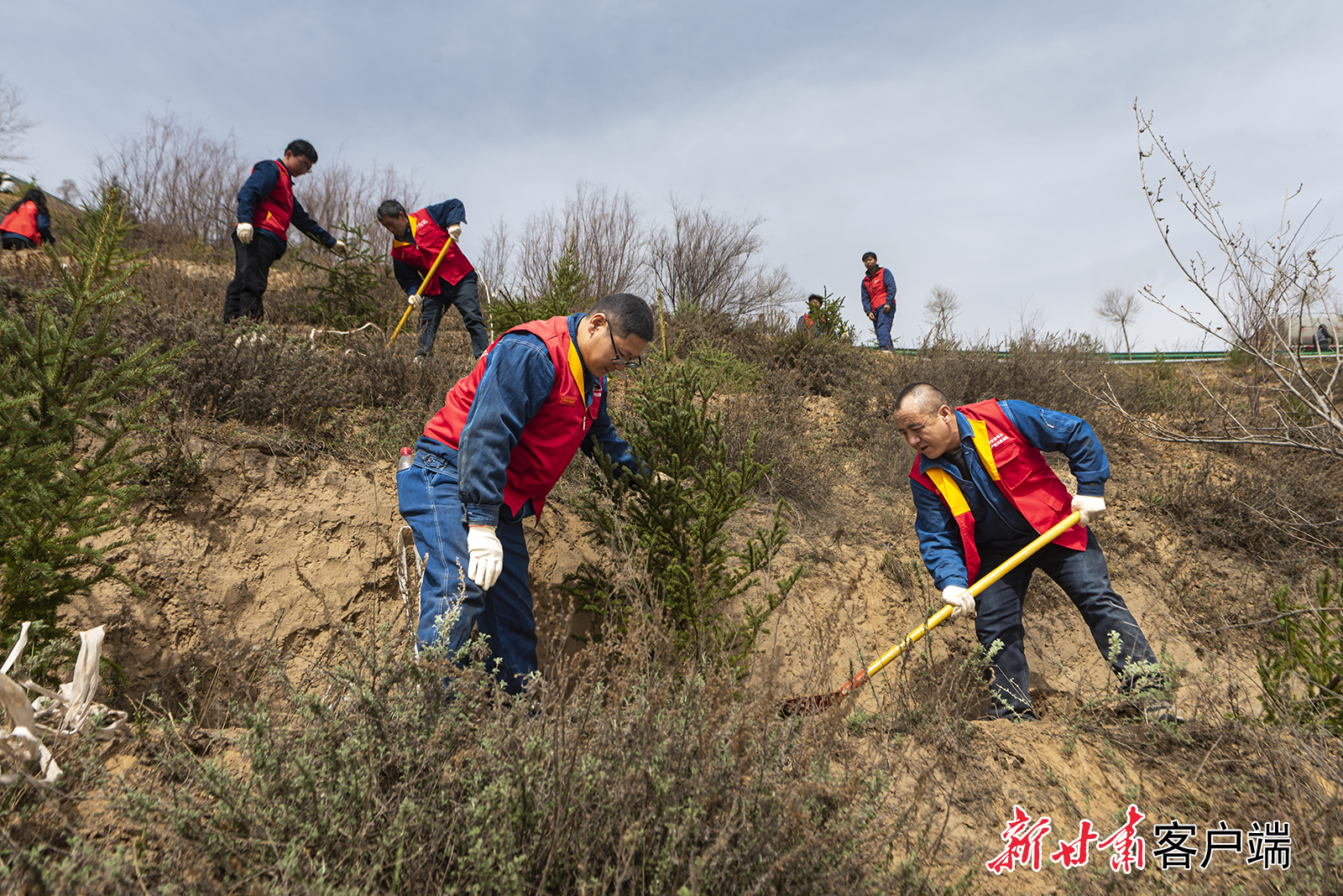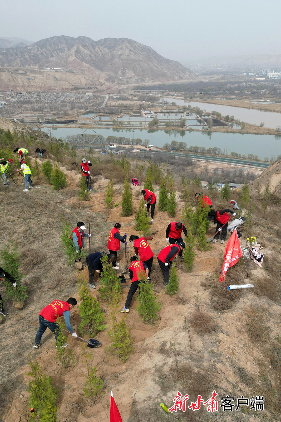 4月3日,永靖县干部职工和志愿者在三塬镇黄河刘家峡水库北岸的荒山荒坡上义务植树,用实际行动为母亲河畔增添新绿。新甘肃·甘肃日报通讯员 史有东