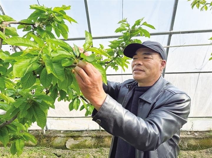 大棚里,合作社负责人汤生兵手持剪刀,修剪樱桃树枝条。“合作社现有20座大棚,主要种植草莓、樱桃、圣女果等。龙德盛农庄作为3A级景区,客源不断,我们入驻后借势发展,收益相当可观。”汤生兵说。