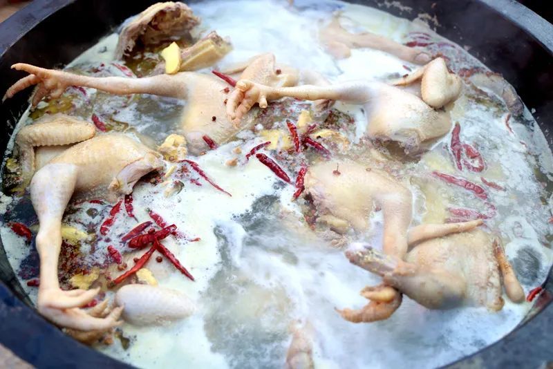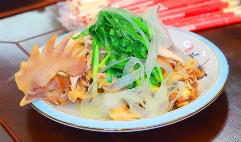 烹饪草芽鸡,过程看似简单,却蕴含无尽智慧。“草芽鸡”制作时选用本地肉质紧实的散养土鸡,烹饪时放入清水,不添加过多繁杂调料,只为保留鸡肉最本真的味道。出锅后的草芽鸡,皮黄肉白,色泽诱人。鸡肉顺着关节和纹理手撕分解,形散神不散,让鸡肉充分吸收汤汁,味道更加浓郁。而这道菜的点睛之笔,便是那一抹嫩绿的头茬韭菜和雪白的粉皮,头茬韭菜辛辣提味,粉皮晶莹剔透,形成“青绿韭菜配雪白粉皮”的视觉美感。