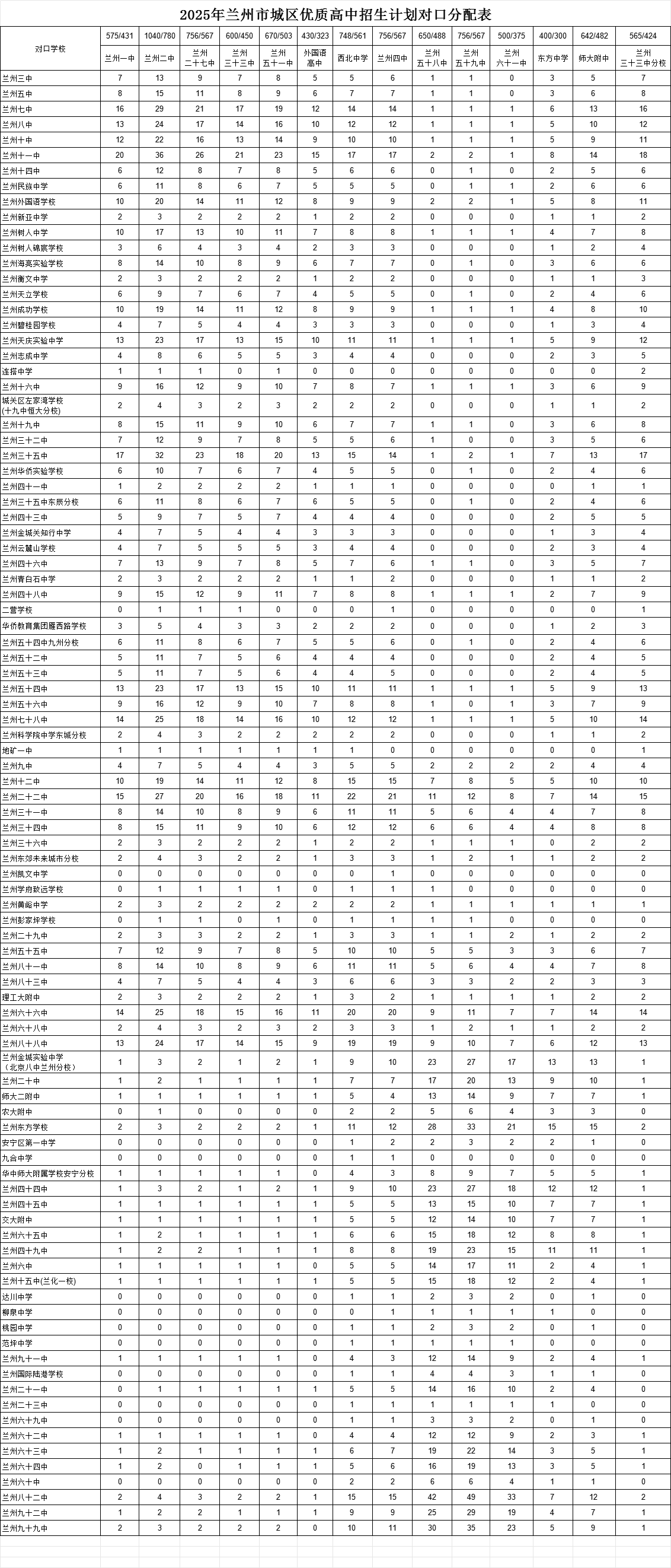 观澜新闻客户端讯(兰州日报社全媒体记者 王巧灵)4月18日,2025年兰州市中考招生计划的公布,优质高中部分招生名额对口分配到初中学校的招生政策再度受到家长的关注。因为按照此前发布的中考招生政策,今年我市继续实行优质高中75%招生名额对口分配到初中学校。根据此次公布的我市优质高中招生计划对口分配表,包括师大附中、兰州一中、兰州四中在内的城区14所优质高中将拿出6818个招生计划对口招生。记者注意到,今年的对口分配名额比去年增加了546名。