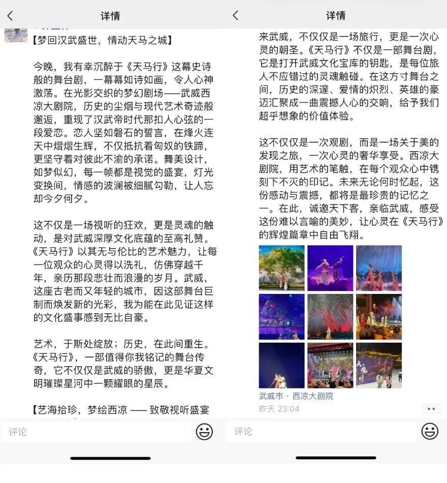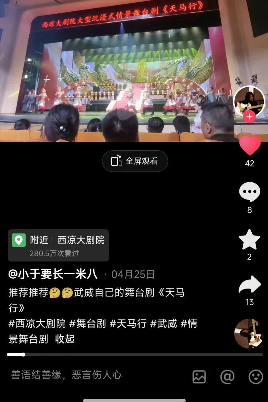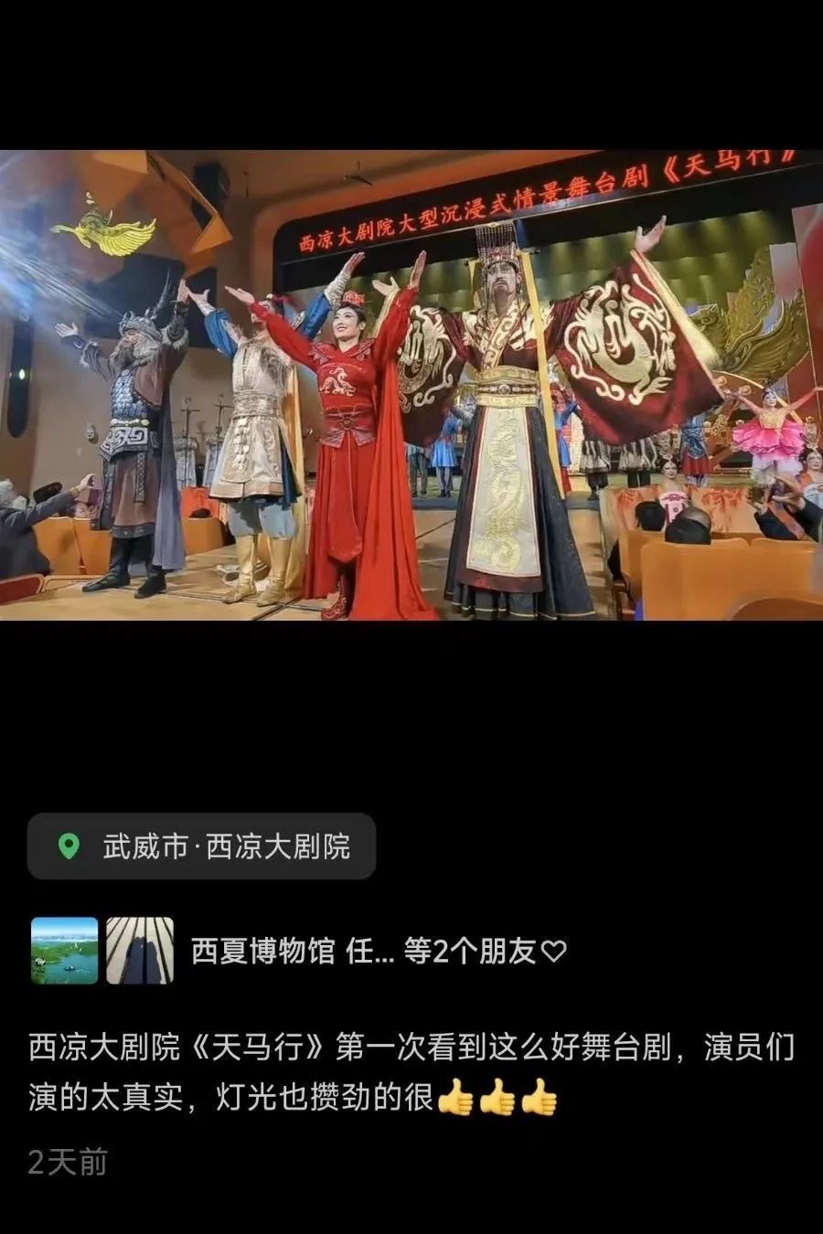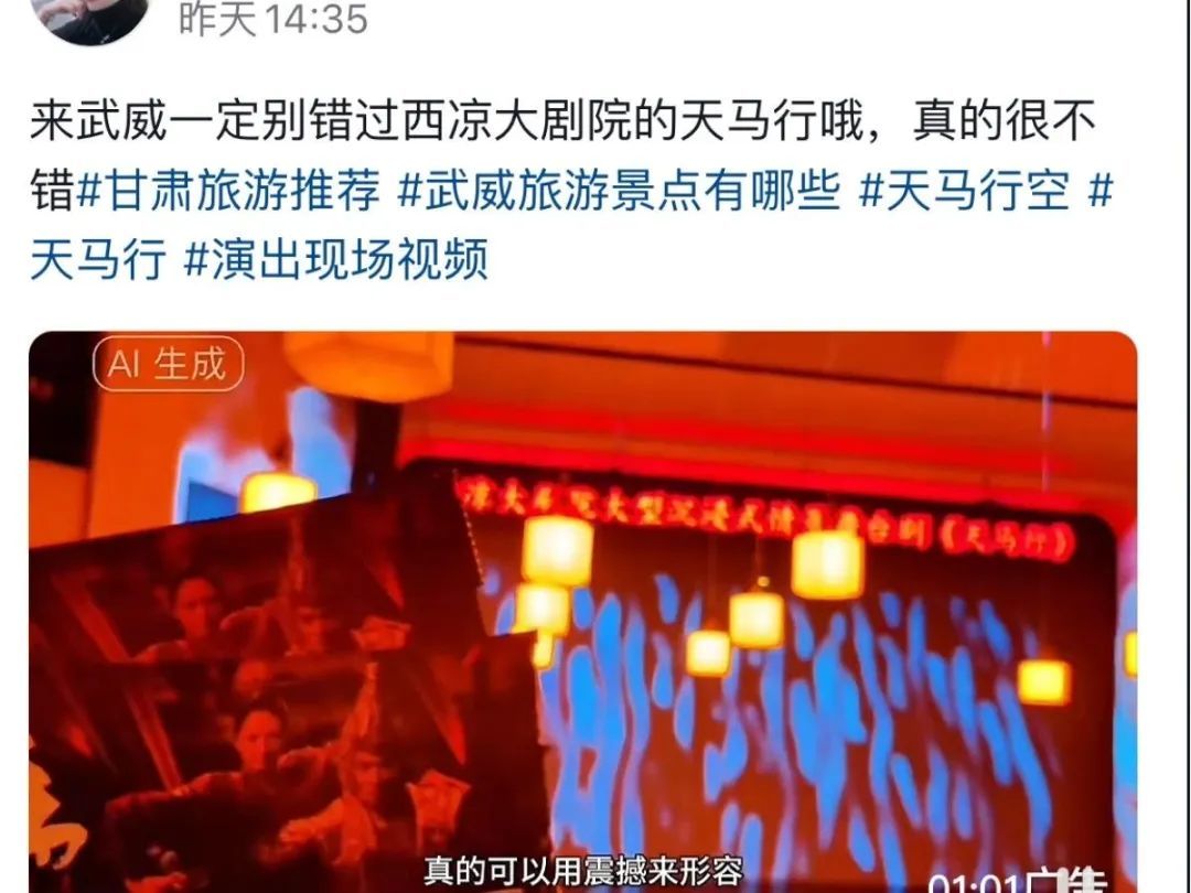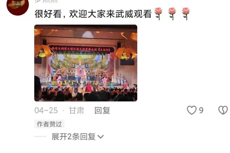 西凉大剧院自2023年5月19日上演《天马行》以来各地观众好评如潮,非常感谢五湖四海观众的支持与厚爱!《天马行》团队在2025年将继续努力为广大游客朋友带来更好的观演感受。