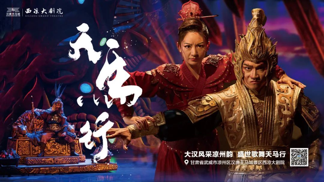 《天马行》是以武威历史文化特色为背景的大型沉浸式情景舞台剧表演。故事中融入了武威标志性的以“天马”(武威雷台汉墓出土的铜奔马为灵感),“龙雀”等神话形象,带领观众进行一次“古今穿越”,让游客体验汉朝在河西走廊上肃清匈奴的故事。选取汉族将士与众匈奴的人物背景作为故事脉络,借助具有强大视觉冲击力的画面与场景,将横跨千年的历史故事重现,全面展示了武威的“天马”精神,传承弘扬凉州“天马”文化。