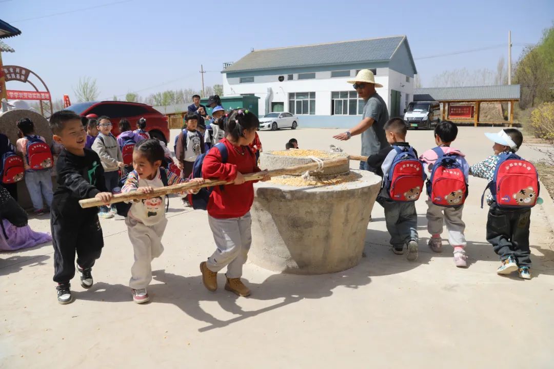 在劳动体验区,孩子们热情高涨,齐心协力给玉米脱粒,小手虽然稚嫩,却十分卖力。推磨时,他们喊着口号,一起用力推动磨盘,感受传统劳作方式的独特魅力。